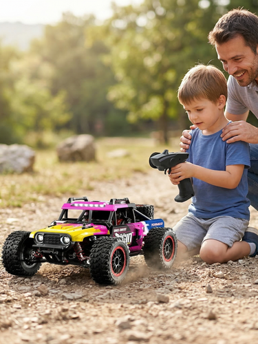 Onze radiografisch bestuurbare auto's zijn gebouwd voor het ruigere werk en halen topsnelheden tot wel 55 km/u. Ideaal voor vaders en zonen! Modder, zand of gras: de sterke schokdempers en 4WD-aandrijving bedwingen elk obstakel. Bezorgd om de snelheid? Geen probleem: met de 3 instelbare snelheidsstanden kunnen ook jonge beginners veilig en gecontroleerd leren racen.