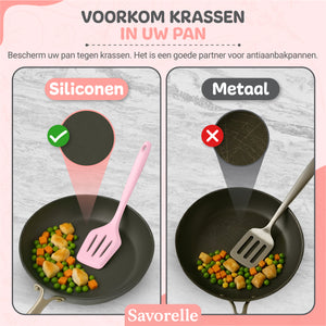In tegenstelling tot houten of metalen keukengerei is siliconen flexibel, buigzaam en vriendelijk voor je kookoppervlak. Zo blijven je pannen krasvrij en gaat je keukengerei veel langer mee.