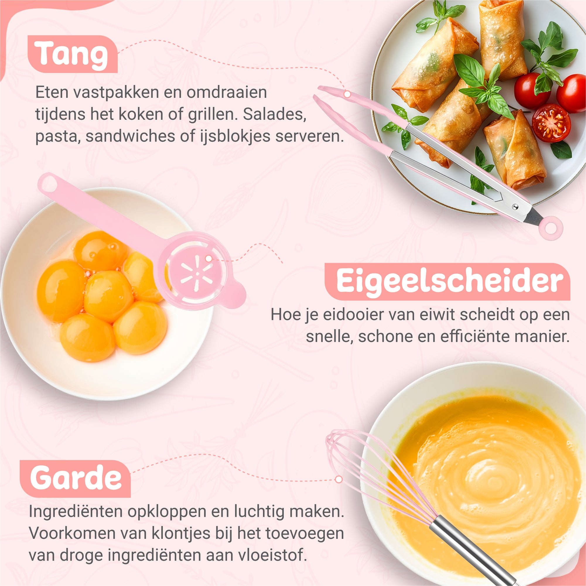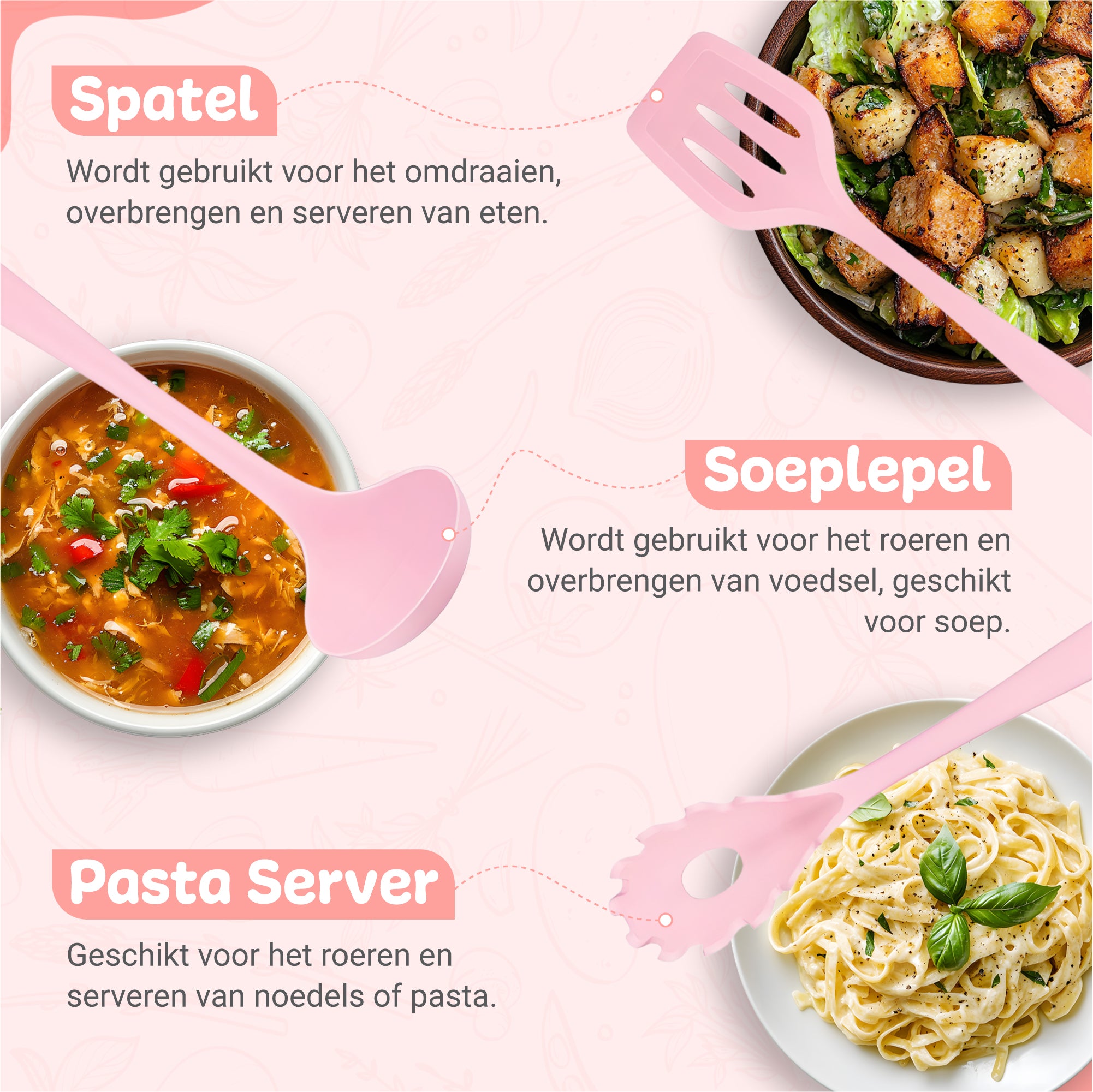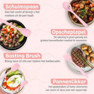 Met een zachte roze kleur en modern design voeg je een vleugje elegantie toe aan je keuken. De tools zijn voorzien van ophanggaatjes én worden geleverd met een praktische houder, zodat je altijd overzicht en gemak hebt.
