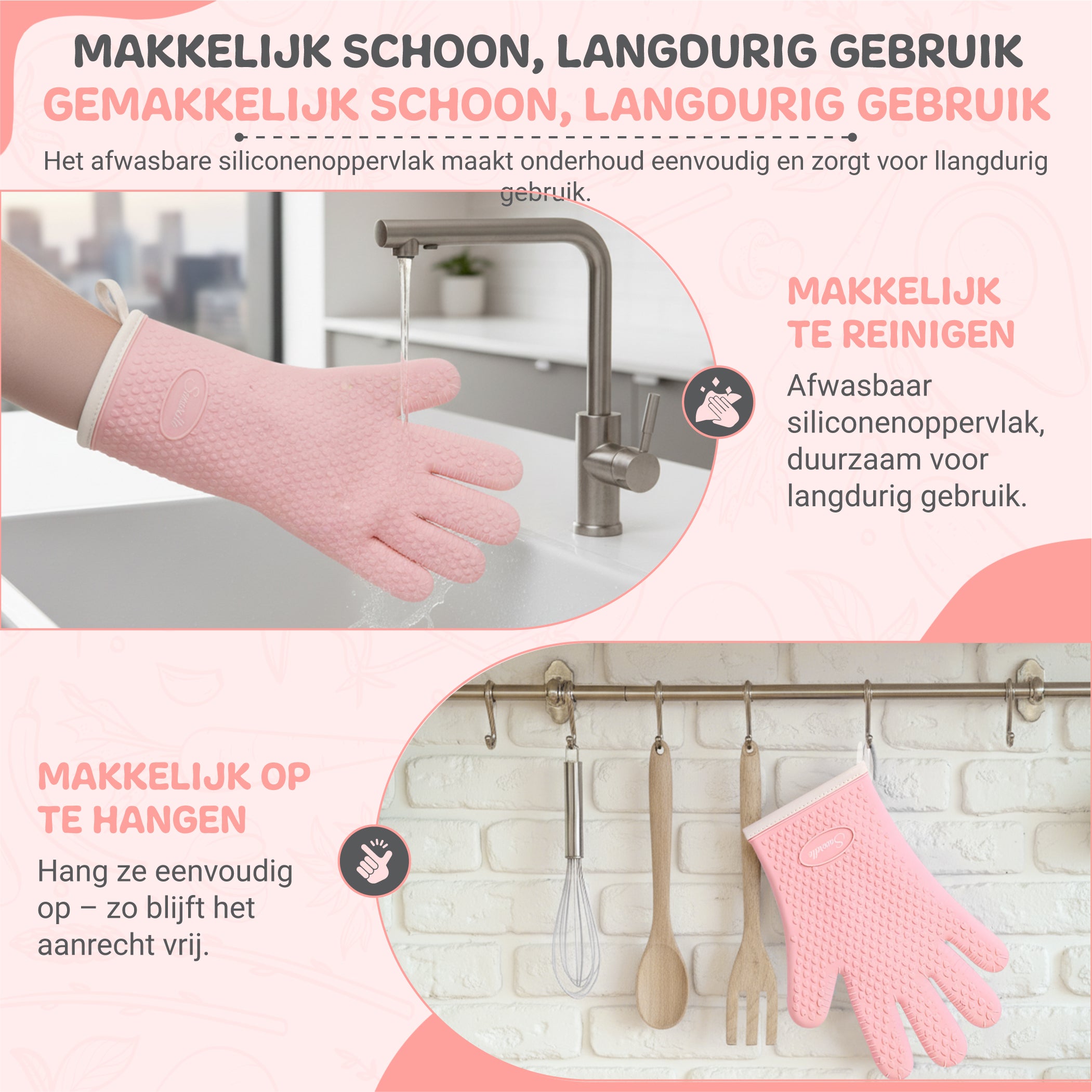 De ovenhandschoenen zijn voorzien van een getextureerde siliconen buitenkant voor maximale grip, gecombineerd met een zachte katoenen binnenvoering. Dit ontwerp biedt niet alleen uitstekende hittebescherming, maar zorgt ook voor uitzonderlijk draagcomfort. Geen zorgen meer over brandwonden of stoom, zelfs niet bij de hoogste temperaturen.